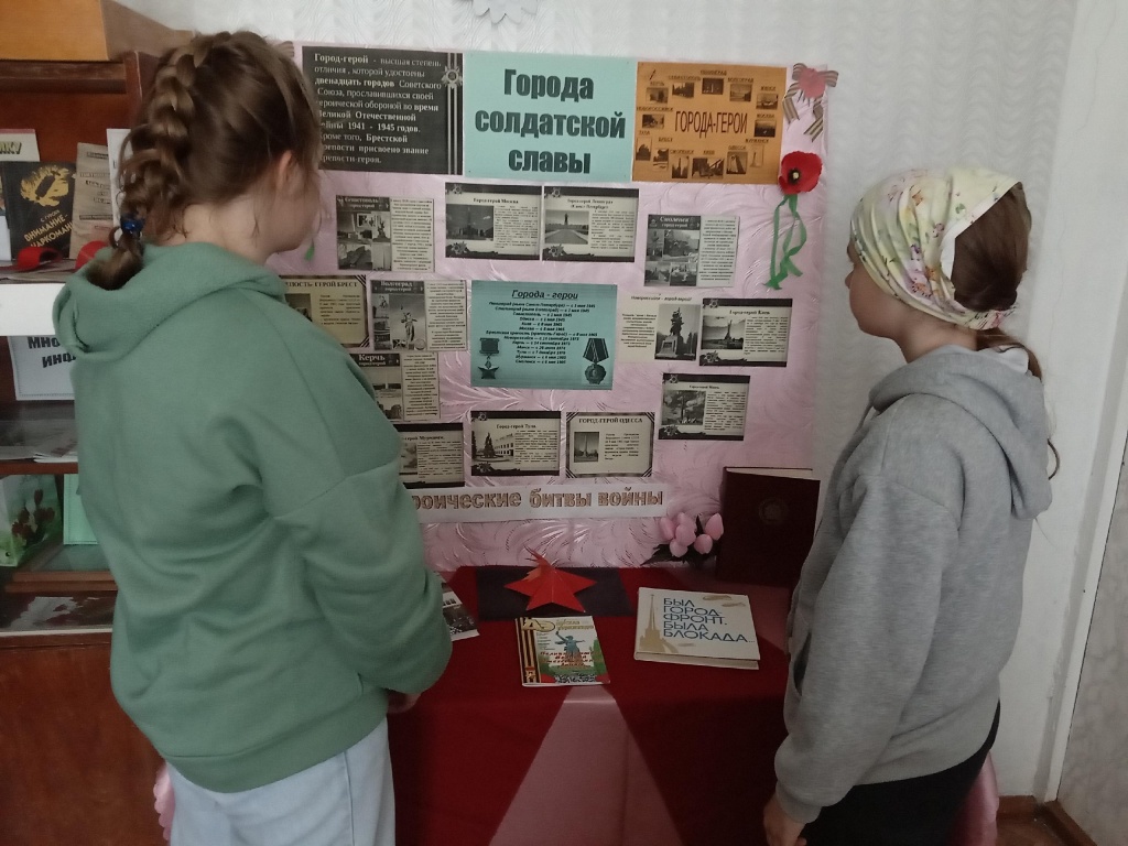 К этому празднику библиотекарь Полеводинской библиотеки оформила книжную выставку "Города солдатской славы". Не только воинам присваивали звания героев, но и целым городам, которые стояли на смерть. Город - герой - высшая степень отличия, которой удостоены двенадцать городов Советского Союза прославившихся своей героической обороной во время Великой Отечественной войны кроме того, Брестской крепости присвоено звание крепости - героя.
