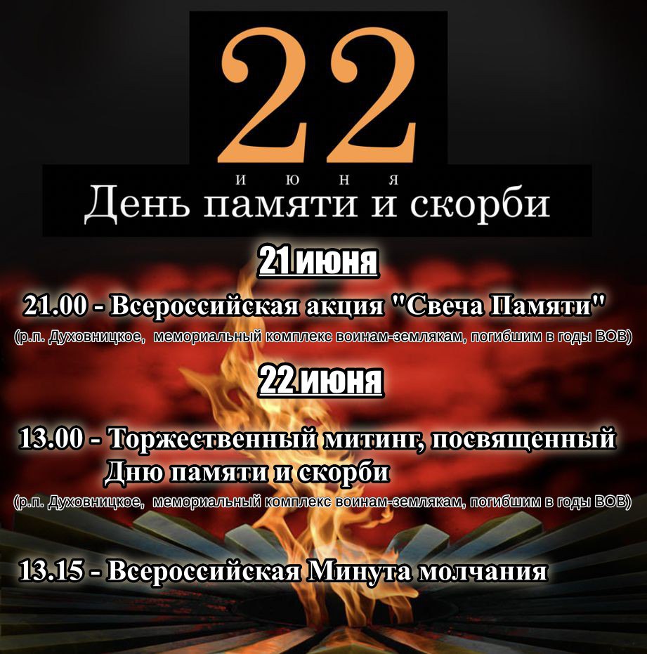 21 июня в 21:00 приглашаем вас принять участие во Всероссийской акции "Свеча памяти", посвященной Дню памяти и скорби, которая состоится на территории мемориального комплекса воинам-землякам, погибшим в годы Великой Отечественной войны 1941-1945г.г.