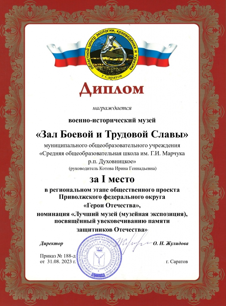 Военно-исторический музей «Зал Боевой и Трудовой Славы» МОУ «СОШ им.Г.И.Марчука р.п.Духовницкое» (руководитель Котова Ирина Геннадьевна) награжден дипломом за I место в региональном этапе общественного проекта Приволжского федерального округа «Герои Отечества» в номинации «Лучший музей (музейная экспозиция), посвященный увековечиванию памяти защитников Отечества».