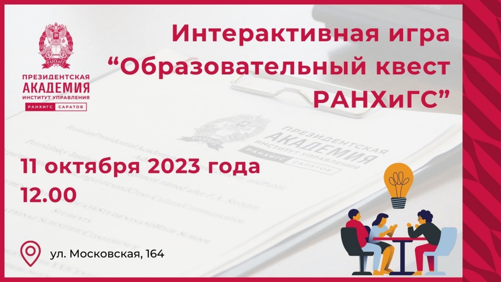 Поволжский институт управления имени П.А. Столыпина РАНХиГС приглашает учащихся старших классов принять участие в интерактивной игре «Образовательный квест РАНХиГС», где каждый желающий сможет в игровой форме познакомиться с направлениями подготовки и специальностями, реализуемыми в Президентской академии.