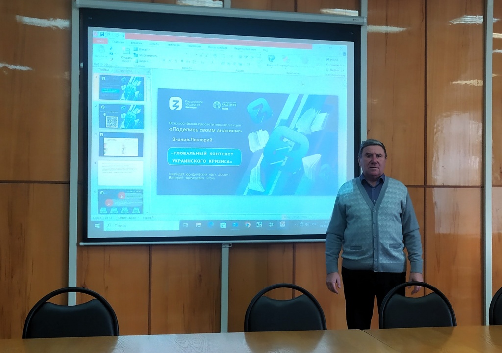 Заведующий кафедрой истории государства, права и международных отношений, доцент Валерий Кузин в качестве представителя саратовского регионального отделения Российского общества «Знание» прочитал лекцию на тему «Глобальный контекст украинского кризиса». В ней обратил внимание на то, что кризис на Украине отражает борьбу за новый передел мира, попытку слабеющего Запада решить свои экономические и политические проблемы за счёт России. Поднимающаяся, суверенная Россия здесь является целью, а Украина, к сожалению, стала инструментом реализации западных интересов.