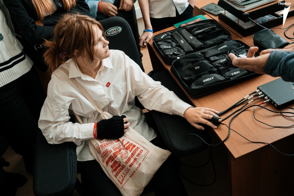 Также учащихся ознакомили с оборудованием Центра – была продемонстрирована работа таких инструментов, как айтрекер и полиграф. Несколько из школьников смогли побывать в роли испытуемых и прошли интервью на полиграфе.