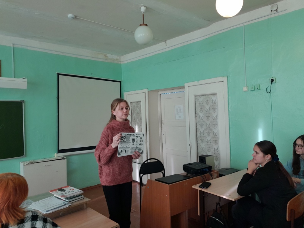 15 декабря Мельникова Т.В., специалист по работе с семьёй ГАУ СО КЦСОН Духовницкого района, в 9 «В» классе (кл. руководитель Верховцева Л.В.) в рамках профилактической акции «Единый день профилактики безнадзорности и правонарушений несовершеннолетних» провела беседу на тему "Профилактика употребления спиртных напитков и энергетиков".