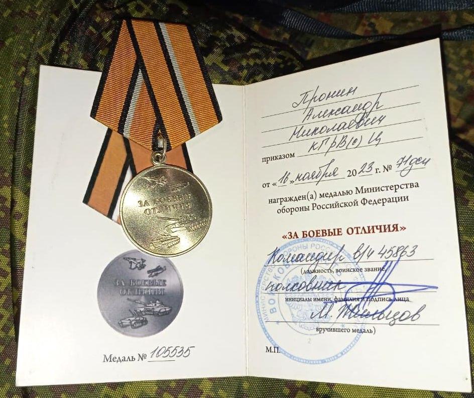 Александр Пронин из села Левенка Духовницкого района Саратовской области получил медаль «За боевые отличия».
