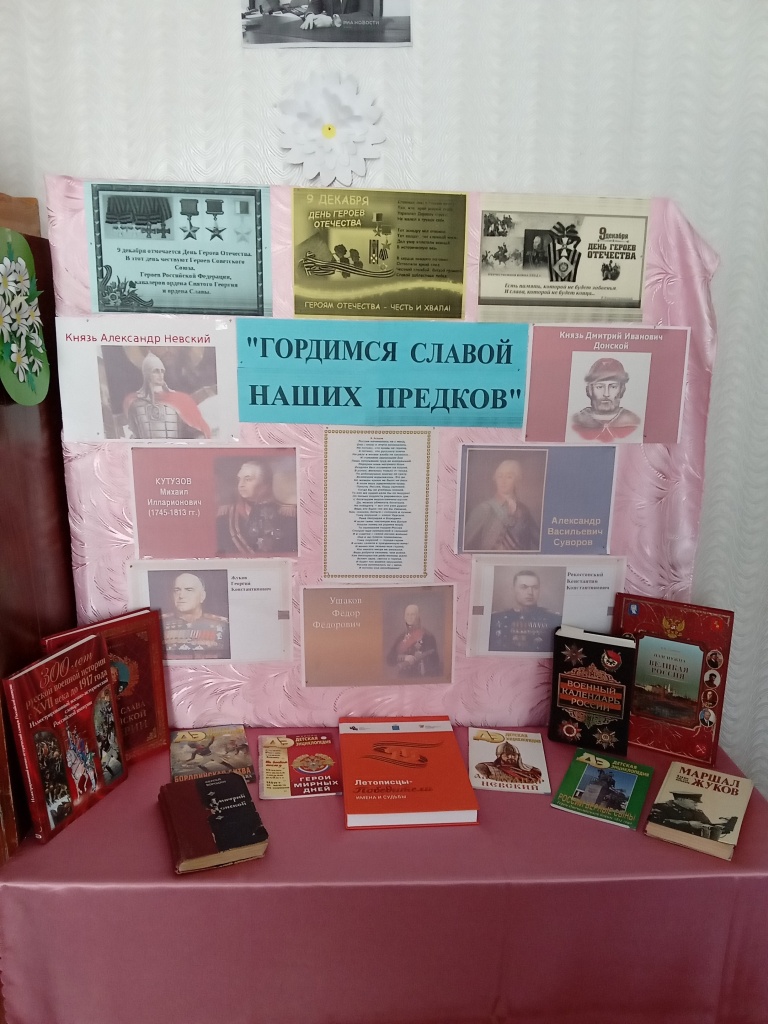 К этому дню библиотекарь подготовила книжную выставку "Гордимся славой наших предков". Где представила книги о ратной славе Российской империи, о героях Великой Отечественной войны и о героях мирных дней.