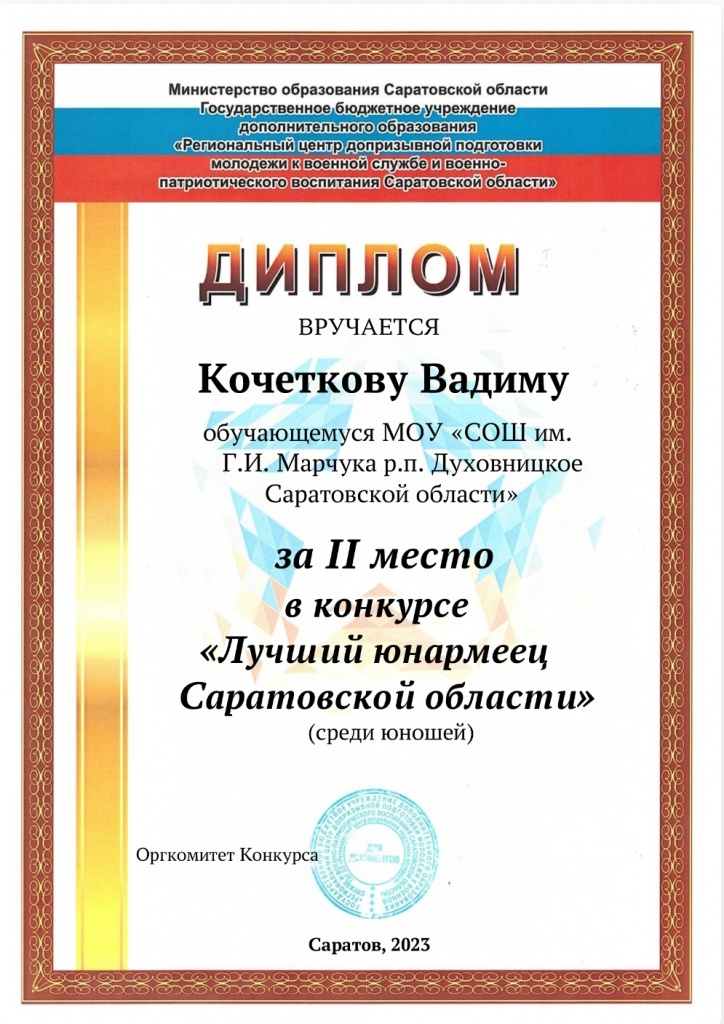 После прохождения первого этапа конкурса, во второй прошли всего 18 ребят, одним из которых стал Кочетков Вадим, ученик 8 "Б" класса МОУ "СОШ им.Г.И. Марчука р.п. Духовницкое Саратовской области" (Отряд Юнармия "Патриоты России" - кл.рук. Немцева Г.А.).