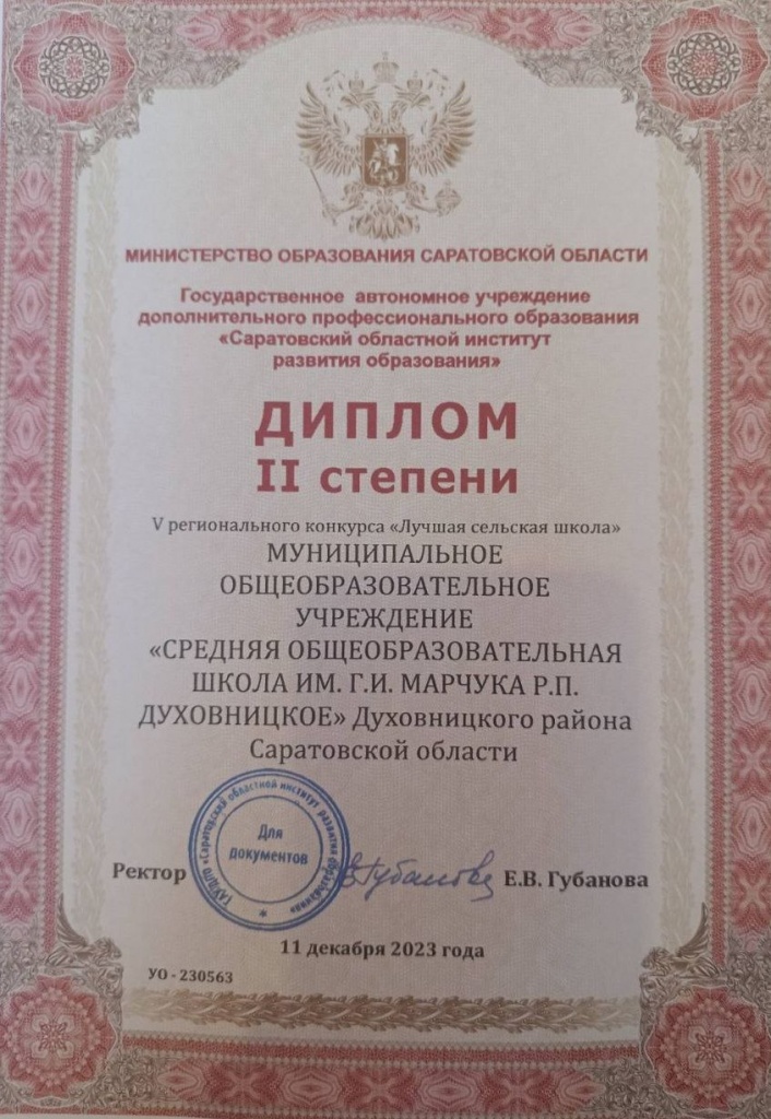 По результатам экспертной оценки в этом конкурсе МОУ "СОШ им. Г. И. Марчука р. п. Духовницкое" получила ДИПЛОМ II степени.