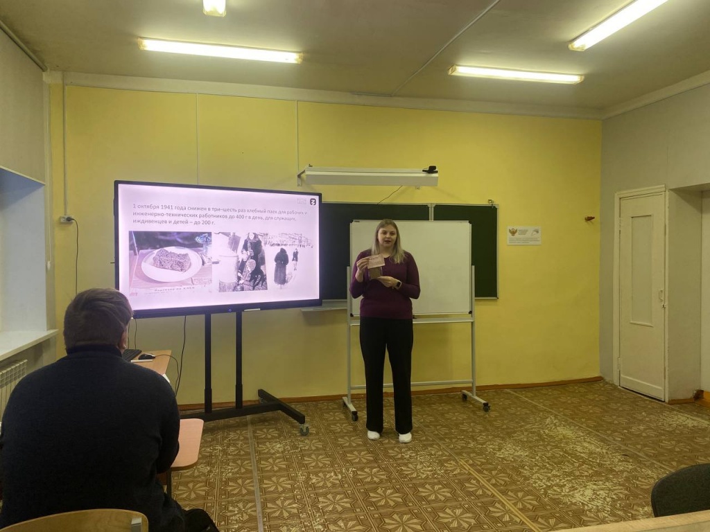 Ирина Александровна рассказала о тяжелых испытаниях, выпавших на долю жителей осажденного закрытого города Ленинграда, выдающийся подвиг соотечественников и героическую борьбу за жизнь. Также лектором был показан документальный фильм «Героическая блокада: история и факты», предоставленный обществом «Знание». Слушатели смогли увидеть кадры города Ленинграда времён блокады. Видеоматериалы никого не оставили равнодушными.