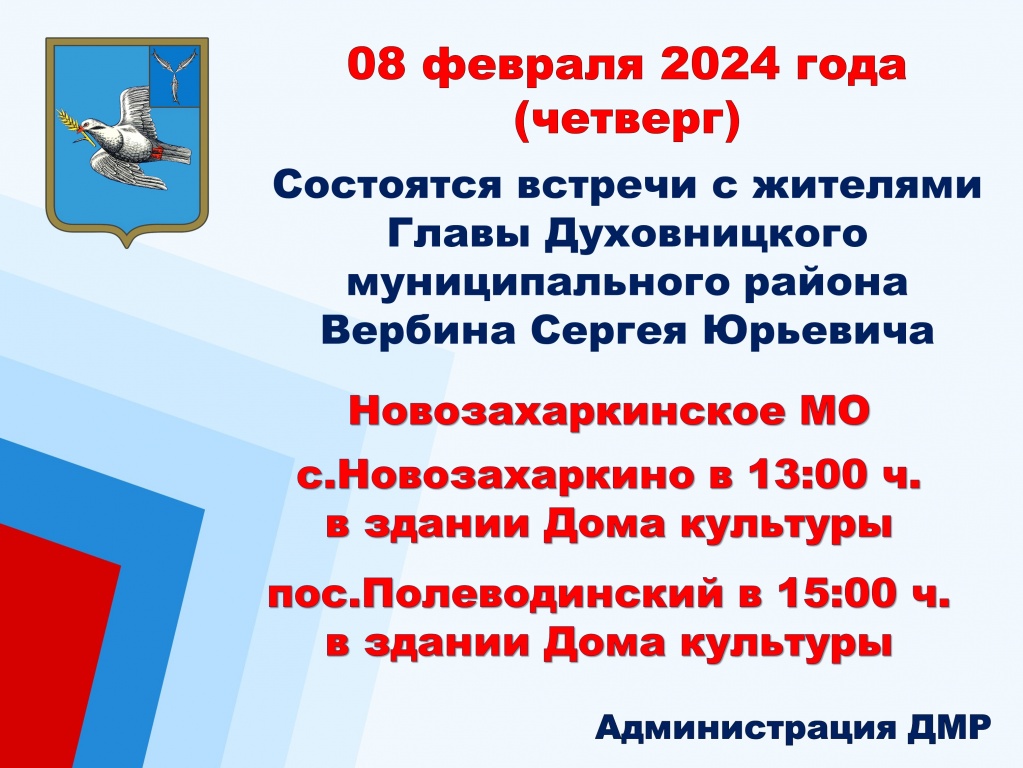 08 февраля состоятся встречи с жителями главы Духовницкого района Сергея Юрьевича Вербина.