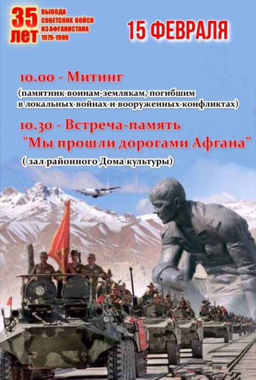 В 10.30, в зале районного Дома культуры, состоится встреча-память "Мы прошли дорогами Афгана," посвященная 35-летию вывода советских войск из Афганистана.