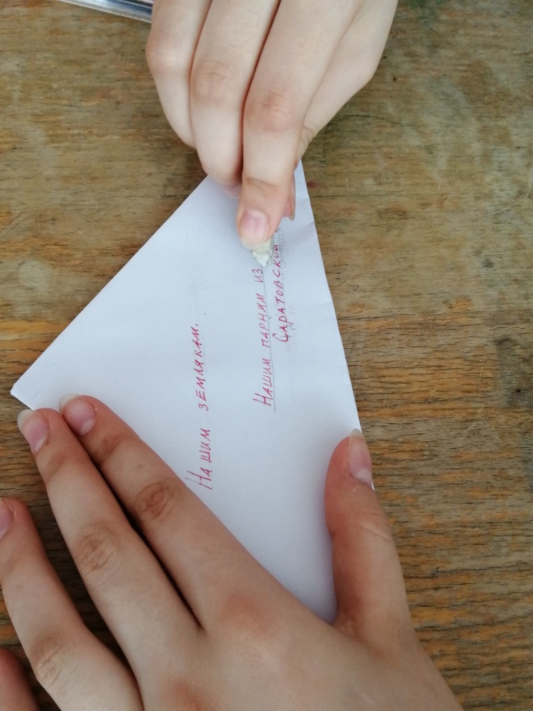 В нашей школе уже стало традиционным написание таких писем нашим землякам – бойцам СВО. Учащиеся 5 класса филиала МОУ «СОШ им.Г.И.Марчука р.п.Духовницкое» с.Липовка приняли участие в акции «Солдатский треугольник». В своих письмах они поздравили наших бойцов с наступающим Днём Защитника Отечества.
