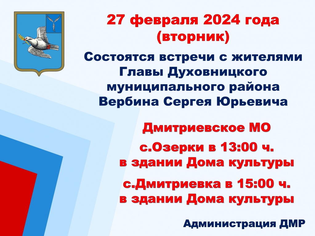 27 февраля состоятся встречи с жителями главы Духовницкого района Сергея Юрьевича Вербина.