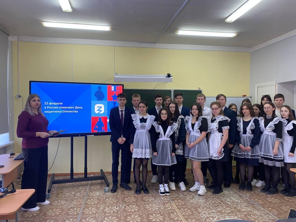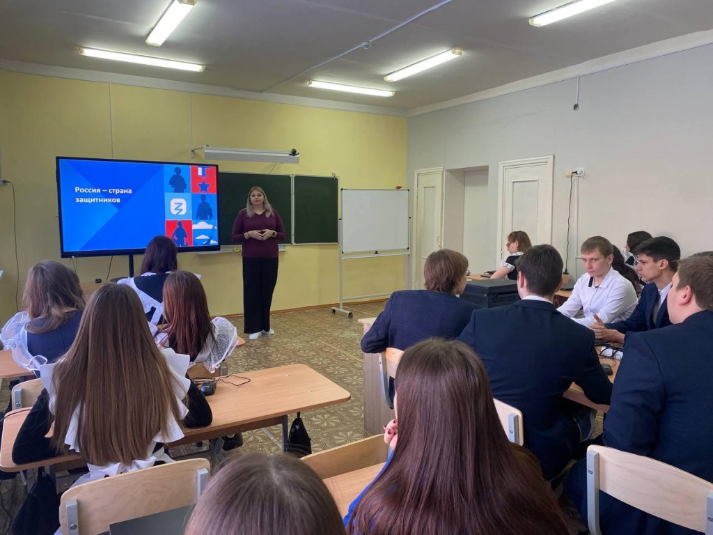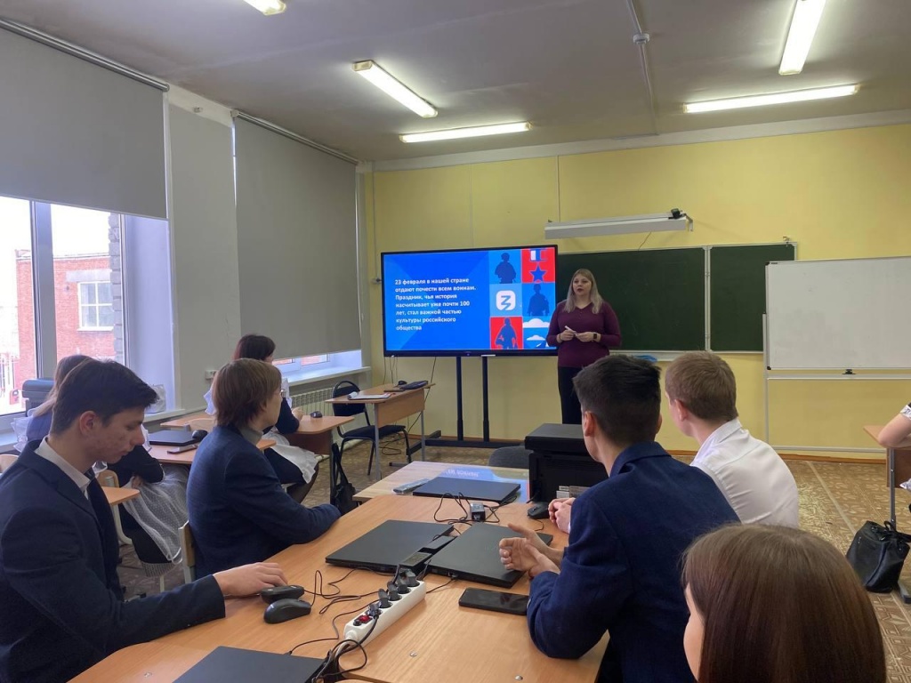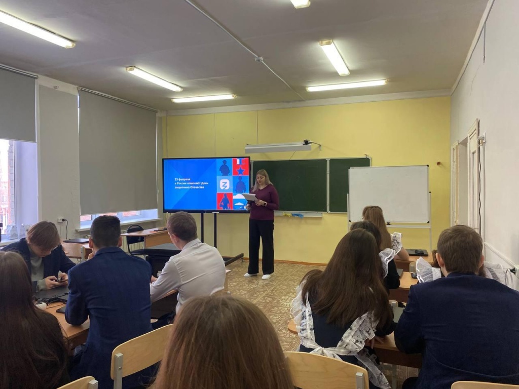 Ирина Александровна рассказала об истории праздника, о подвигах, победах и славных традициях нашей страны. Также лектором был показан документальный фильм «Россия - страна защитников», предоставленный обществом «Знание».