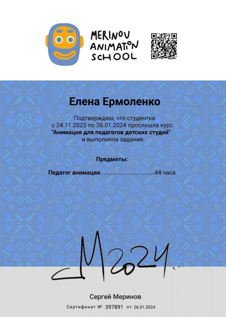 Пройдя курс «Анимация для педагогов детских студий» Елена Юрьевна получила квалификацию педагог - анимации. И теперь со своими учениками приступили к изучению искусства производства мультфильмов.