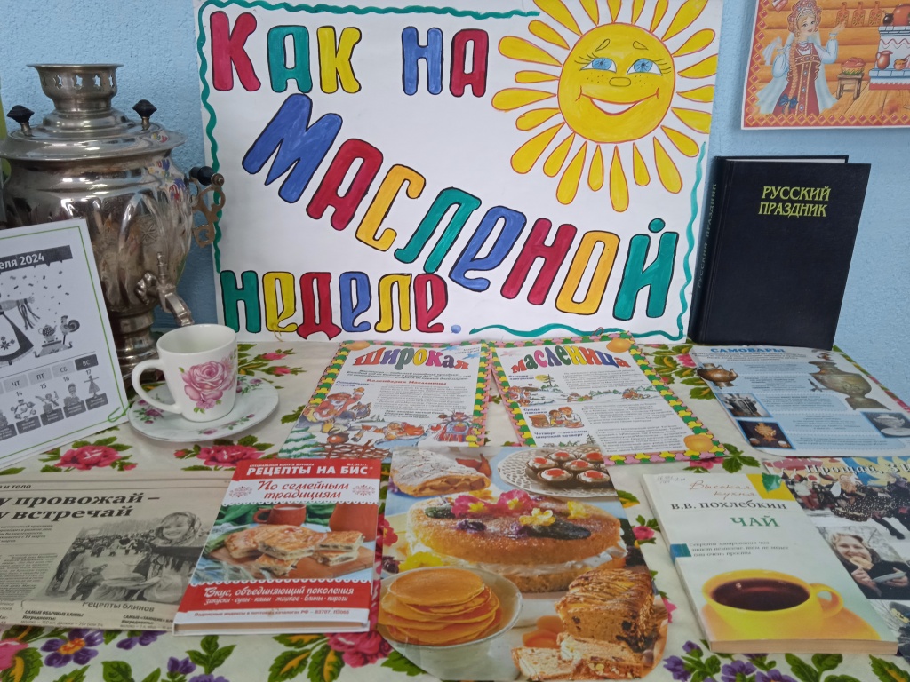 На красочной выставке представлена информация о истории праздника, названии и традициях каждого дня блинной недели, рецепты вкусных блинов и пирогов, книги о самом вкусном русском напитке - чае.