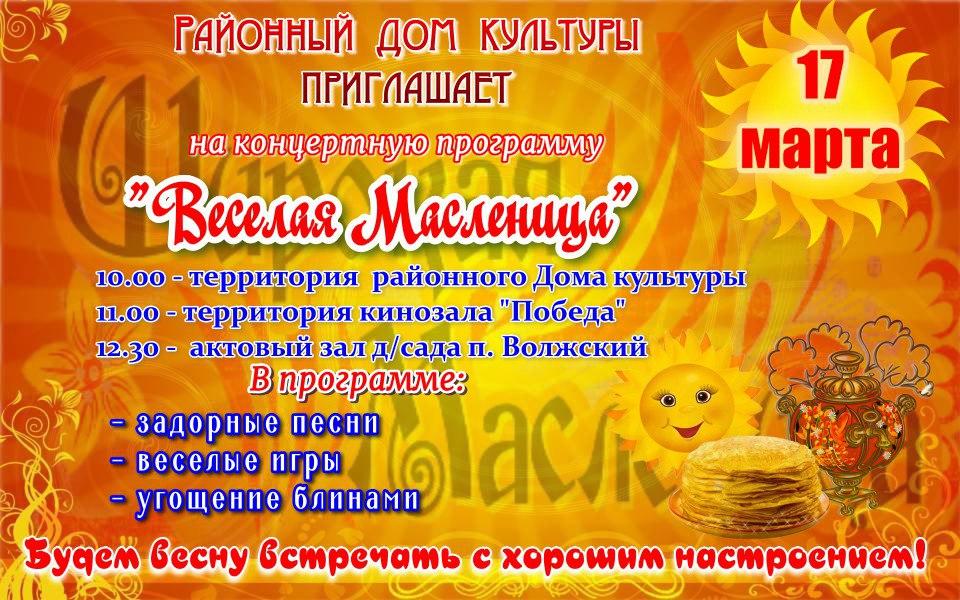 17 марта Районный Дом культуры приглашает на концертную программу "Веселая Масленица"