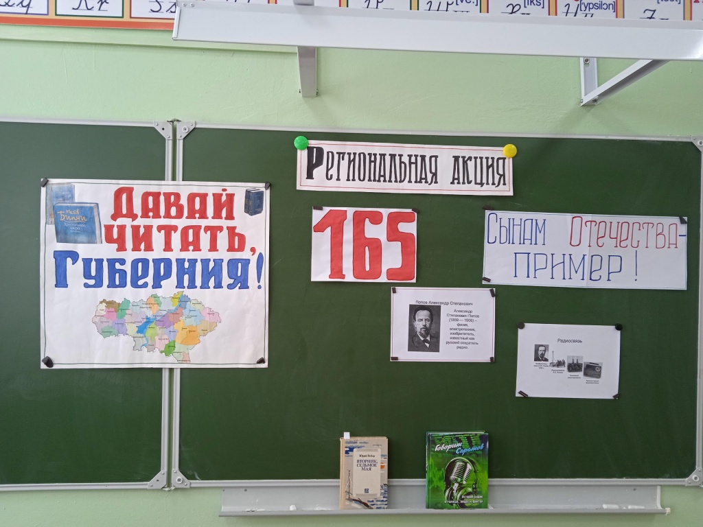 Дмитриевская библиотека - филиал в рамках региональной акции «Давай читать, Губерния!» по теме «Сынам Отечества — пример!» для учащихся 5-8 классов провела познавательный час «Изобретатель радио — А. С. Попов» к 165 летию изобретателя.