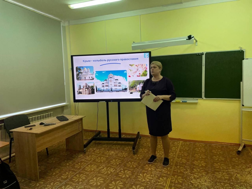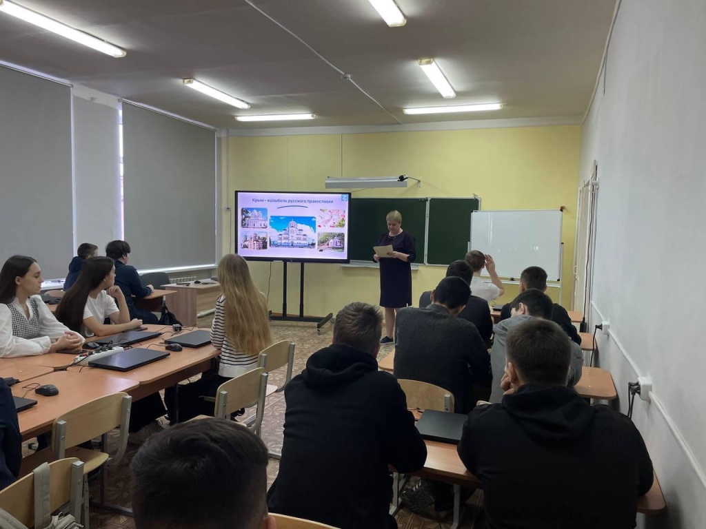 После лектория учащиеся посмотрели документальный фильм «Хронотоп. История присоединения Крыма» и узнали занимательные факты о военных и дипломатических победах России в борьбе за Черноморье.