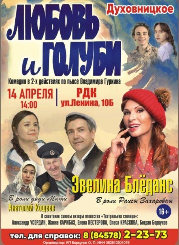 14 апреля 14.00 в Районном Доме культуры пройдёт спектакль "Любовь и голуби" по пьесе Владимира Гуркина.