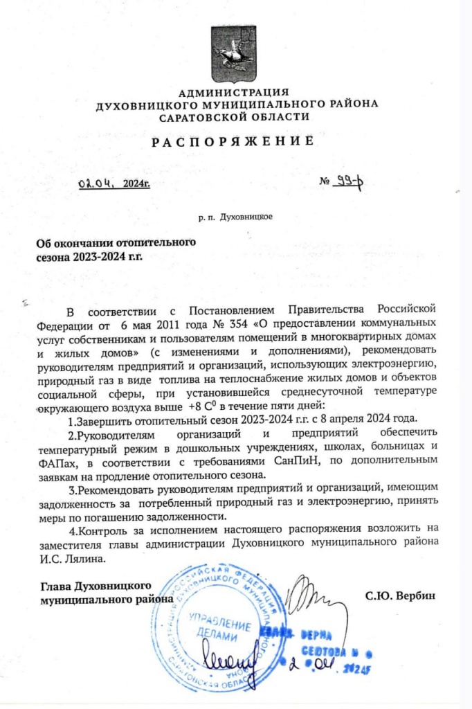 В связи с установлением постоянной положительной температуры наружного воздуха, главой Духовницкого района Сергеем Вербиным подписано распоряжение об окончании отопительного сезона 2023-2024 гг. с 08 апреля 2024 года.