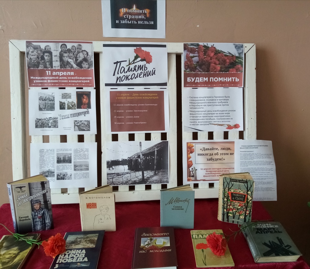 К этой дате в Брыковском филиале библиотеке подготовлена патриотическая выставка-реквием «Память поколений». Сохранить память об узниках фашистских концлагерей — священный долг каждого. Только сохраняя память о тех страшных событиях, можно надеяться на то, что подобное больше никогда не повторится в человеческой истории. Бесчеловечные преступления, которые совершались немецкими карателями в местах смерти, описаны на страницах многих журналов и книг.