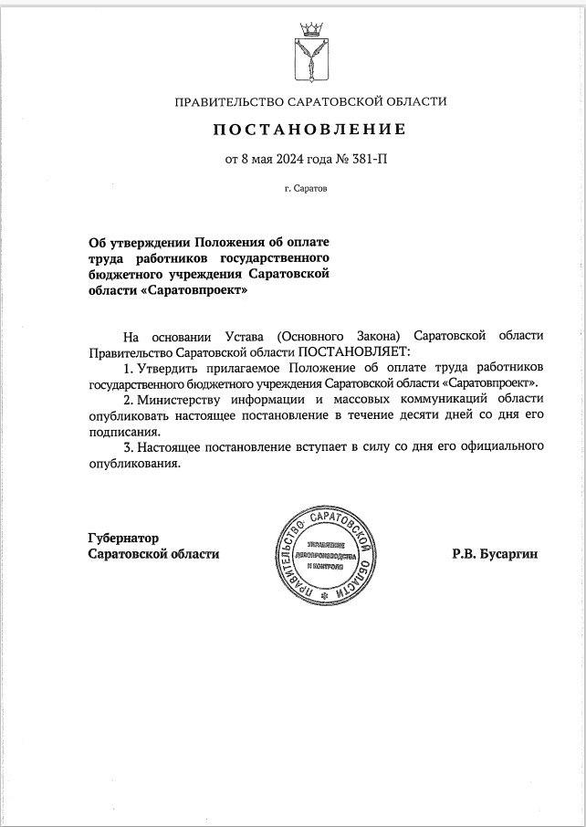 Утверждено положение об оплате труда работников ГБУ «Саратовпроект».