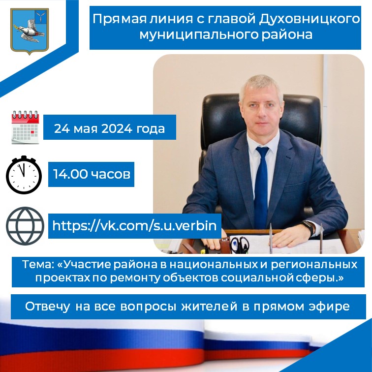 Трансляция будет вестись на странице главы района Сергея Вербина Вконтакте (https://clck.ru/34kQao), а так же в сообществе администрации Духовницкого муниципального района (https://clck.ru/34kQap), в ходе которой будут затронуты актуальные вопросы, которые волнуют жителей.