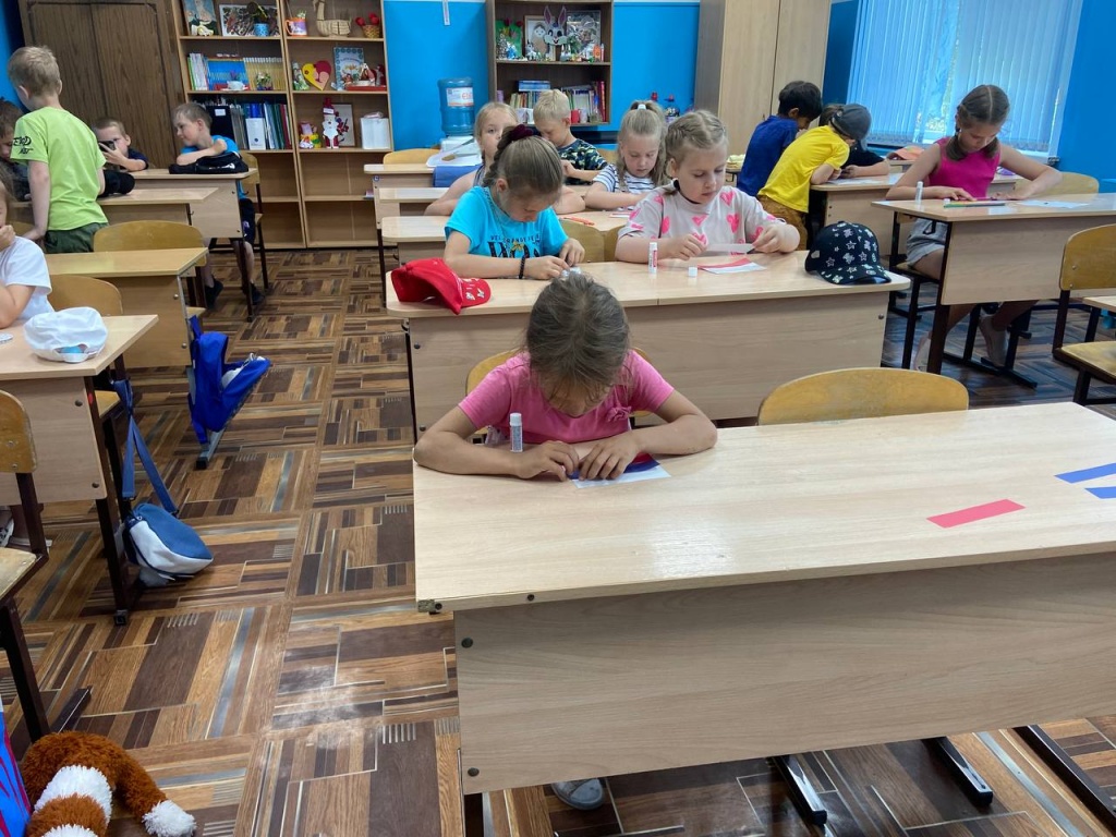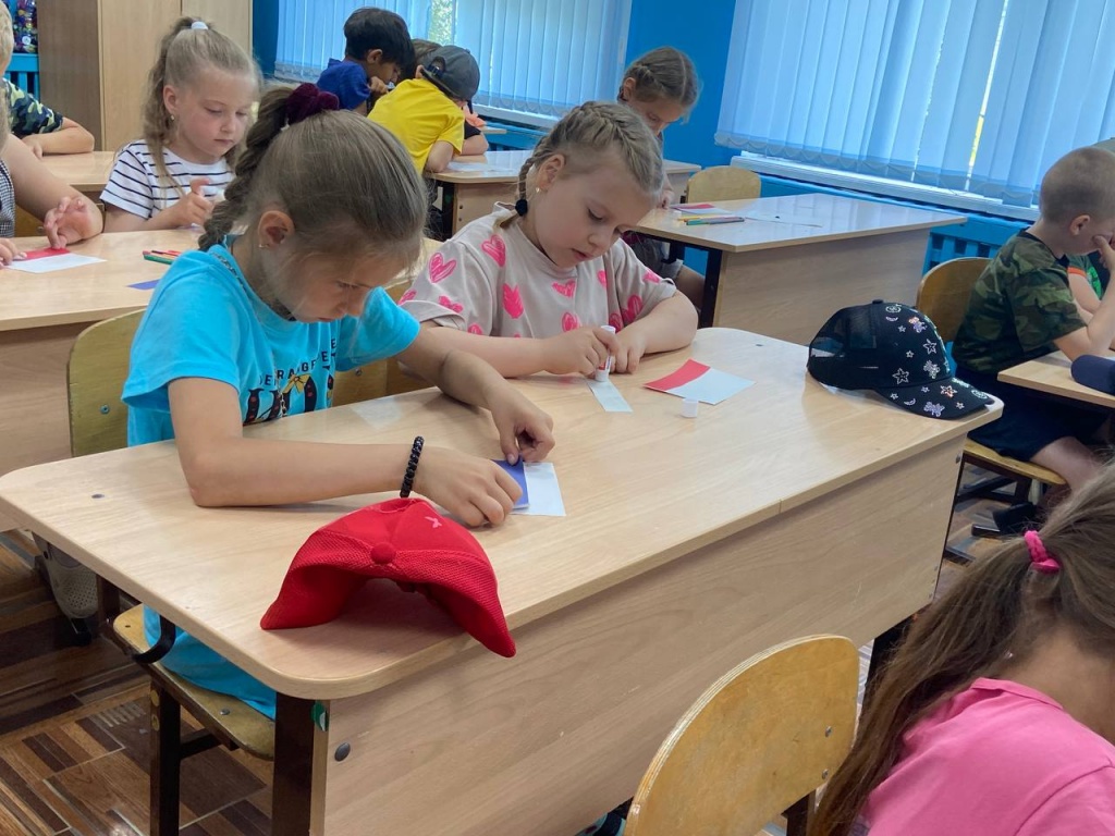 Вернувшись из кинотеатра, дети собрались в игровых комнатах и приступили к изготовлению поделок ко Дню России.