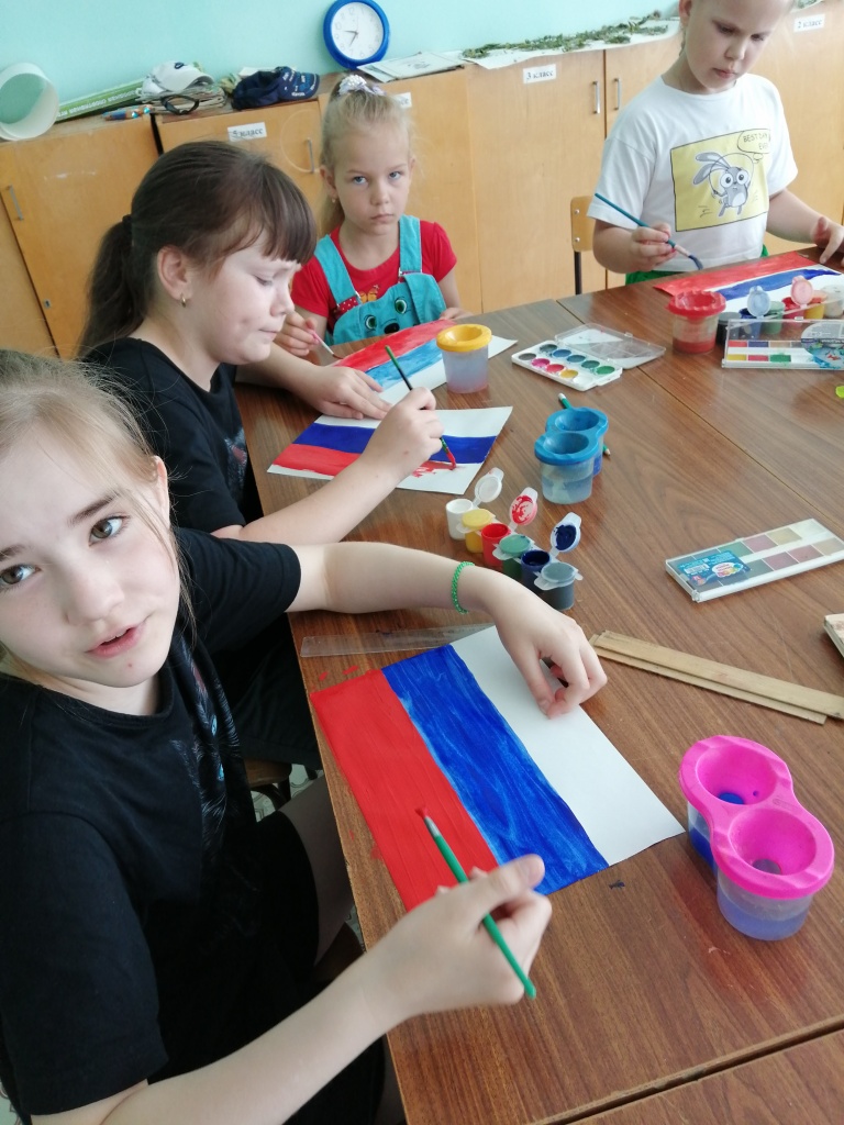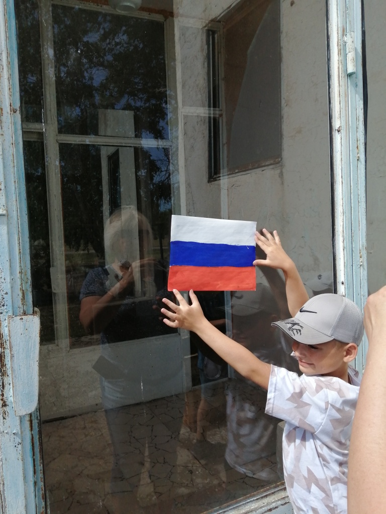 Дети с воодушевлением нарисовали Российские флаги и украсили ими здания: школы, администрации, почтового отделения и д.р.
