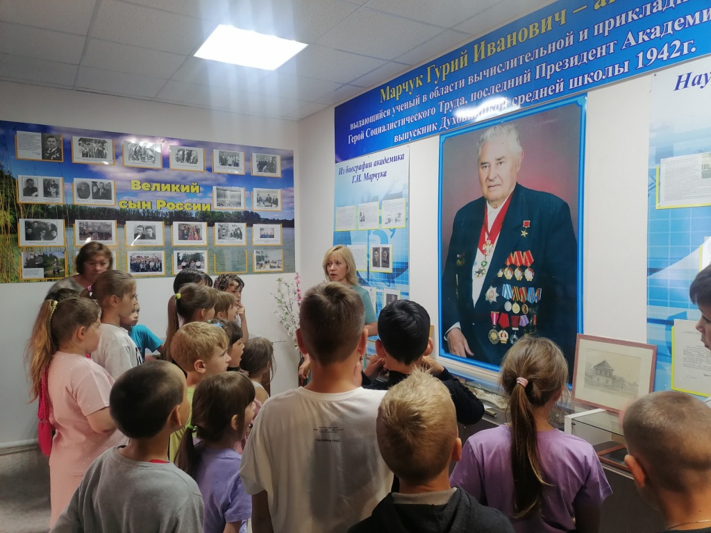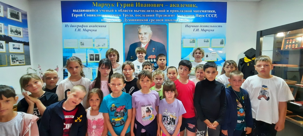 В этот день обучающиеся МОУ "СОШ им.Г.И.Марчука р.п.Духовницкое", посещающие детскую оздоровительную площадку, побывали в школьном музее, где для них была проведена экскурсия по комнате-экспозиции "Великий сын России" в обновленном после ремонта музее.