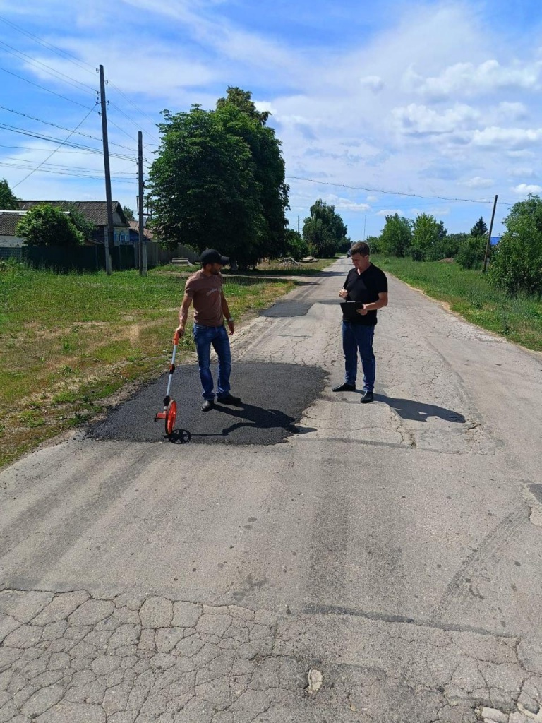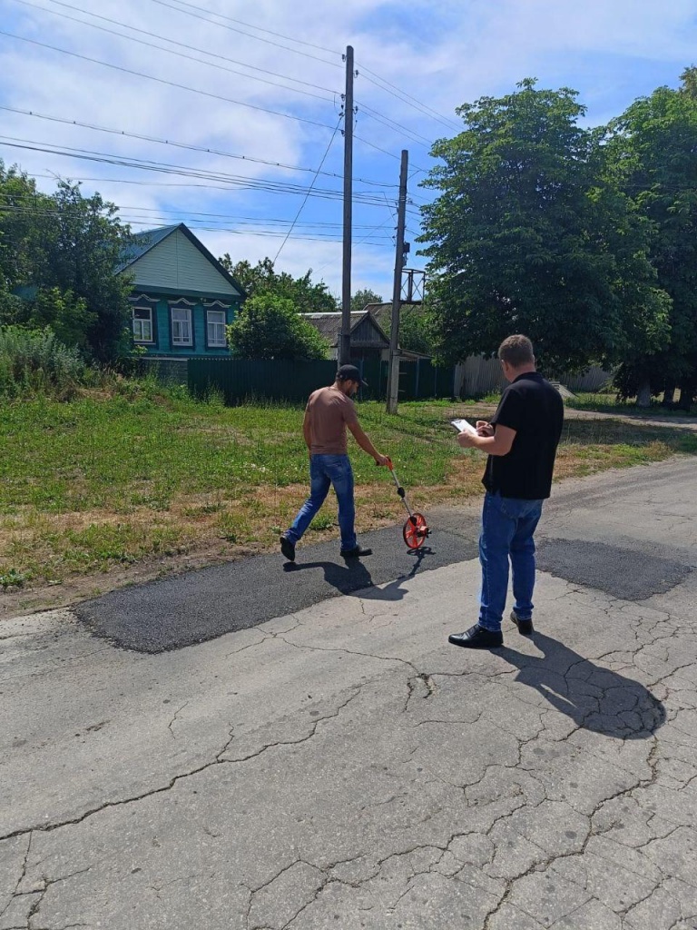 Заместитель главы администрации ДМР Лялин И. С. в присутствии подрядчика, проводит замеры объёмов выполненных работ на ул. Свобода.