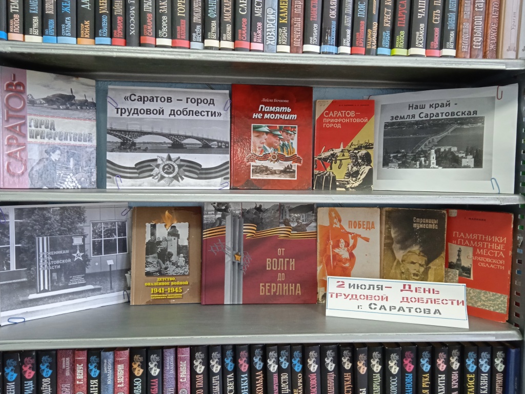 В Дмитриевской библиотеке к этой знаменательной дате оформлена книжная выставка «Саратов - город трудовой доблести», где представлена краеведческая литература о героизме сотен тысяч саратовцев в годы войны.