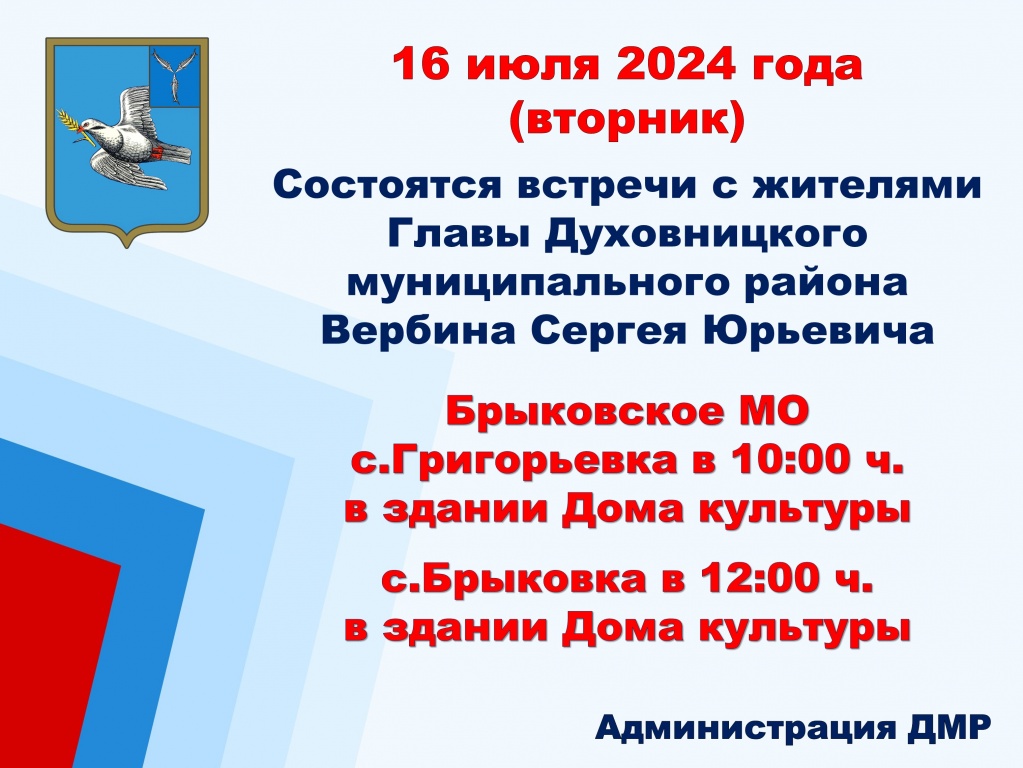 16 июля состоятся встречи с жителями главы Духовницкого района Сергея Юрьевича Вербина.