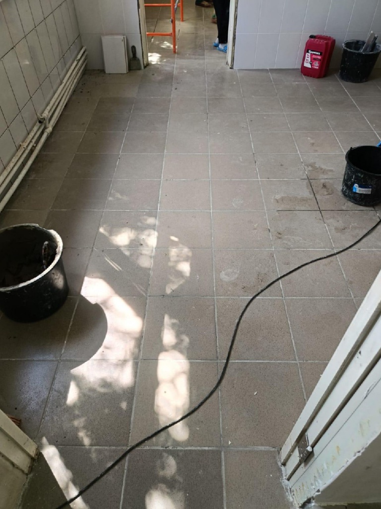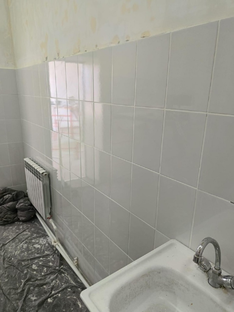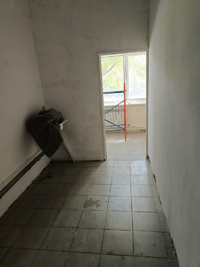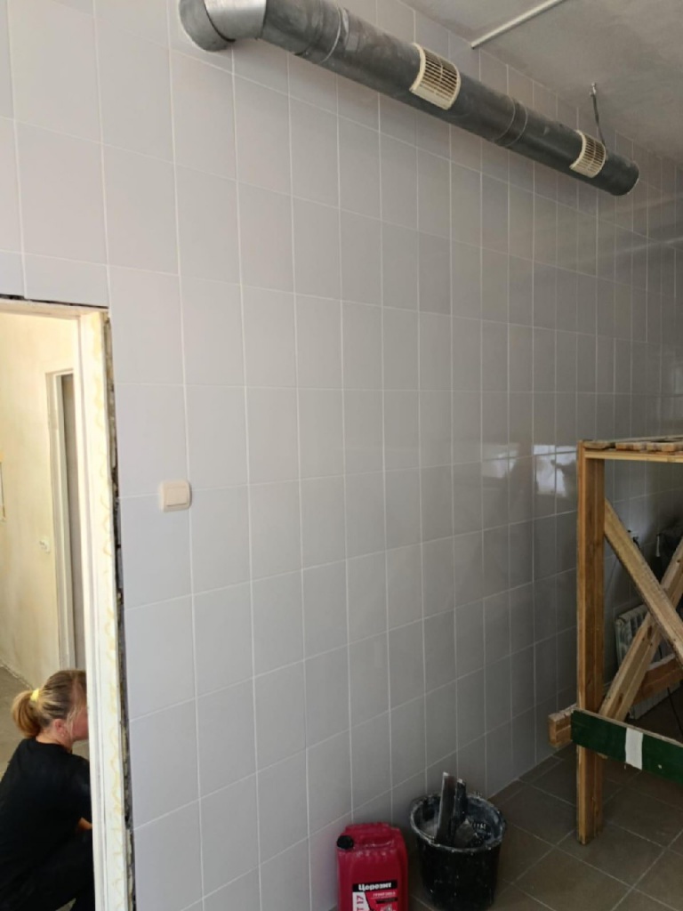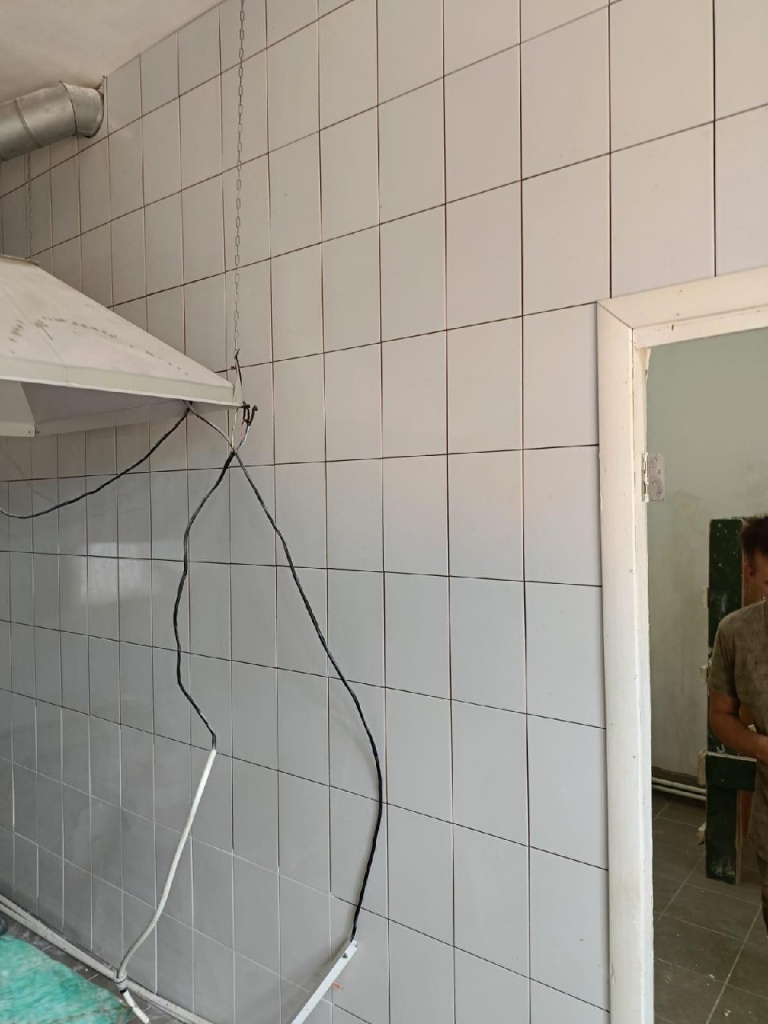 На текущий момент на пищеблоке полностью заменена стяжка пола, уложена плитка на полы и на стены в помещениях, выровнены и готовятся стены, и потолки под покраску.
