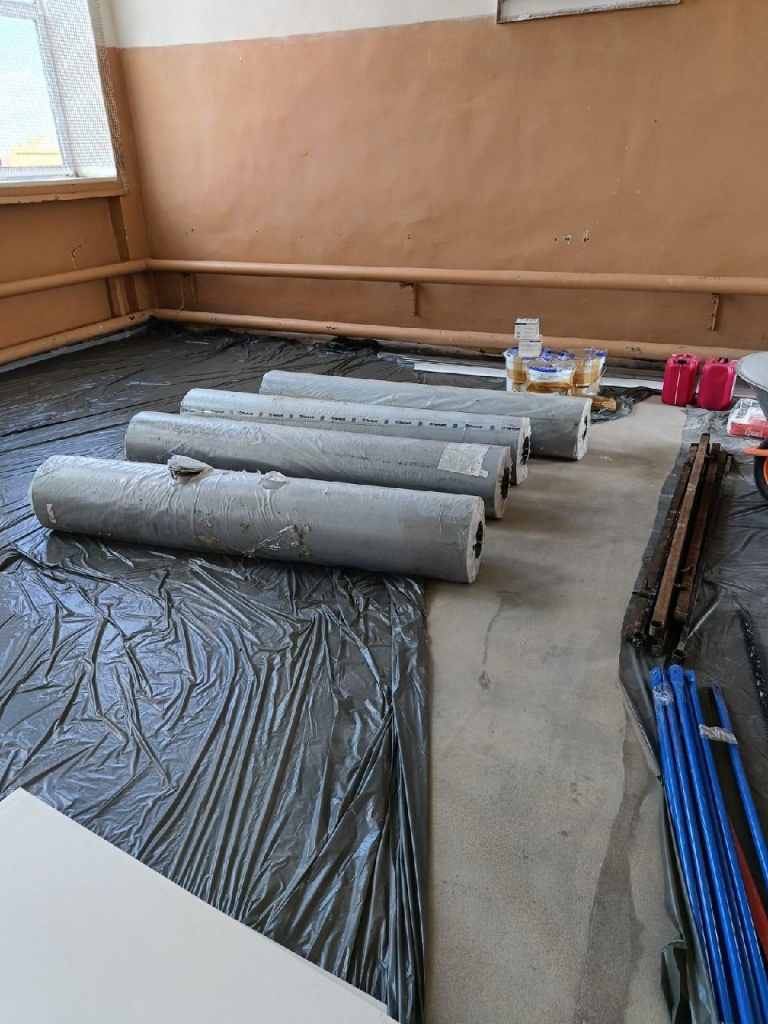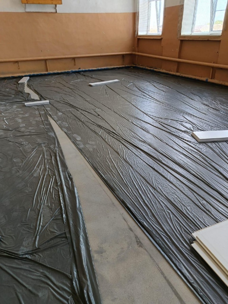 В спортзале полностью заменена стяжка пола, и подготовлено основание с утеплением для укладки специального спортивного покрытия.
