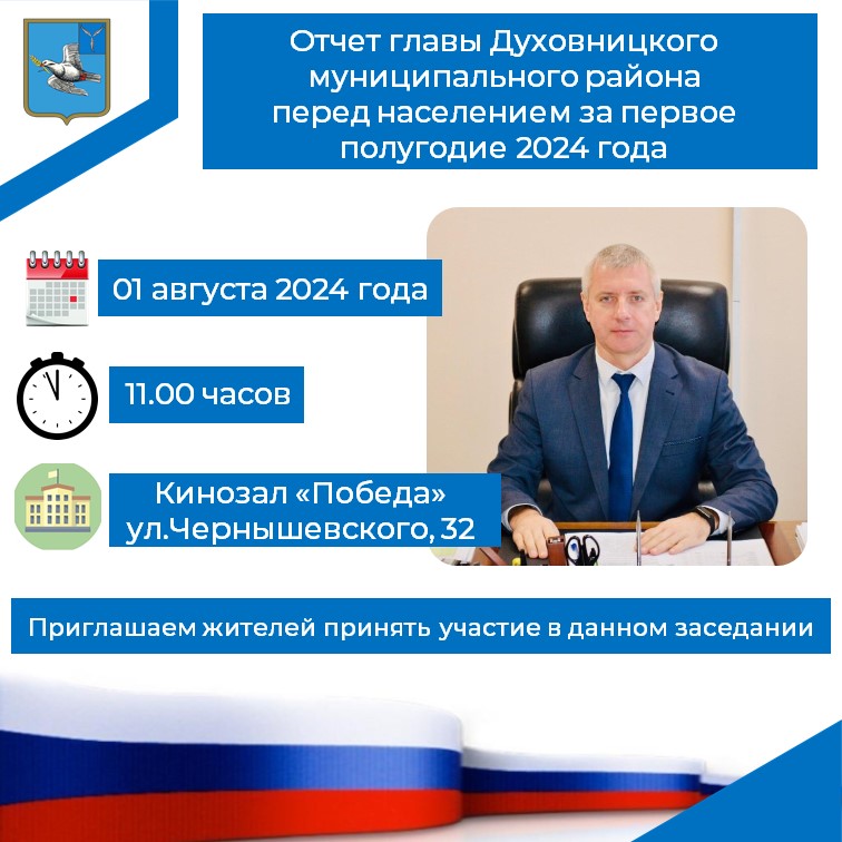 01 августа 2024 года в 11:00 часов в здании кинозала «Победа» (ул. Чернышевского д. 32) состоится отчет главы Духовницкого муниципального района перед населением за первое полугодие 2024 года.