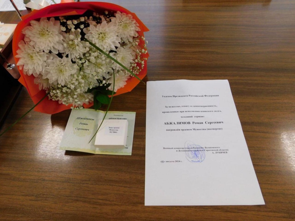 Сегодня в администрации района награду вручили маме бойца – Абжалимовой Наталье Александровне. Глава района Сергей Вербин и глава Березово-Лукского муниципального образования Владимир Шавандин выразили слова благодарности за подвиг сына.