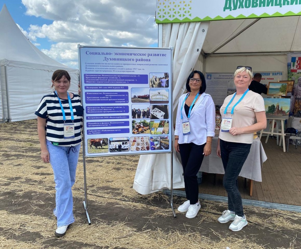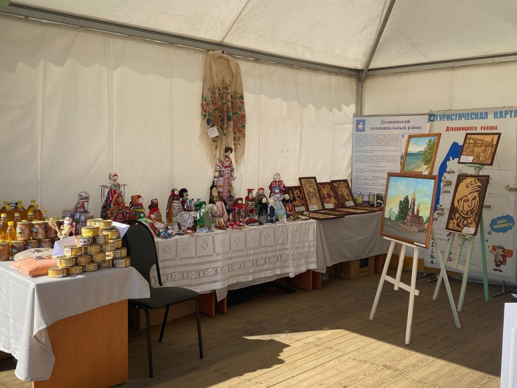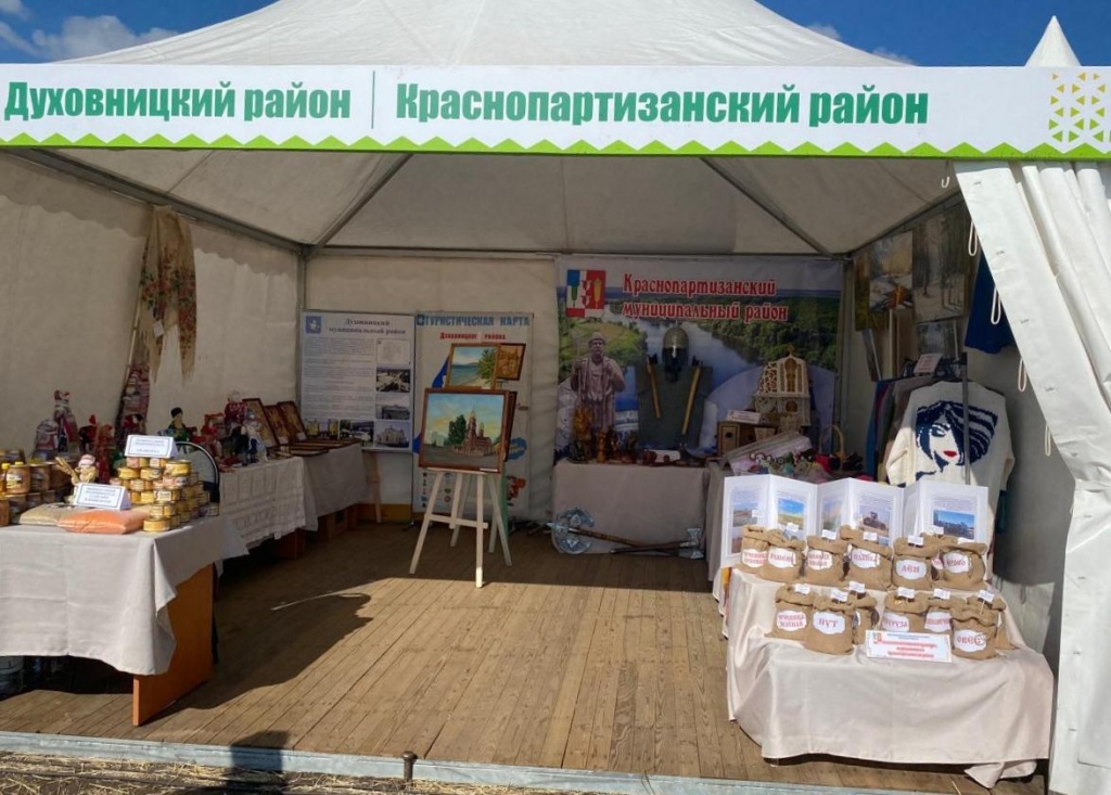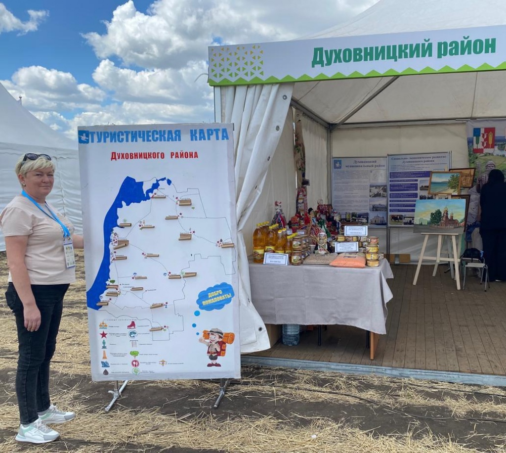 Наш район представлен на мероприятии экземплярами декоративно-прикладного искусства умельцев Духовницкого района: Дома народной куклы с. Берёзовая Лука руководитель Пименова Е.В., работы выжигание, резьба по дереву Стародубцева С.В. и обучающихся МОУ "СОШ им.М.В.Скворцова с.Берёзовая Лука", работами преподавателя Суворовой А.С. и обучающихся отделения «Изобразительное искусство» детской школы искусств р.п.Духовницкое, образцами продукции ИП Ваулина В.И. и ИП Ушанкова В.А., а также образцами сельскохозяйственных культур, выращенных передовым хозяйством района (ИП Клепиков О.Ю.)