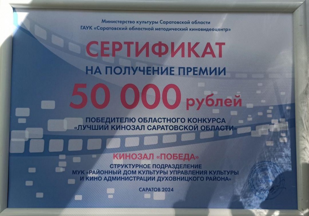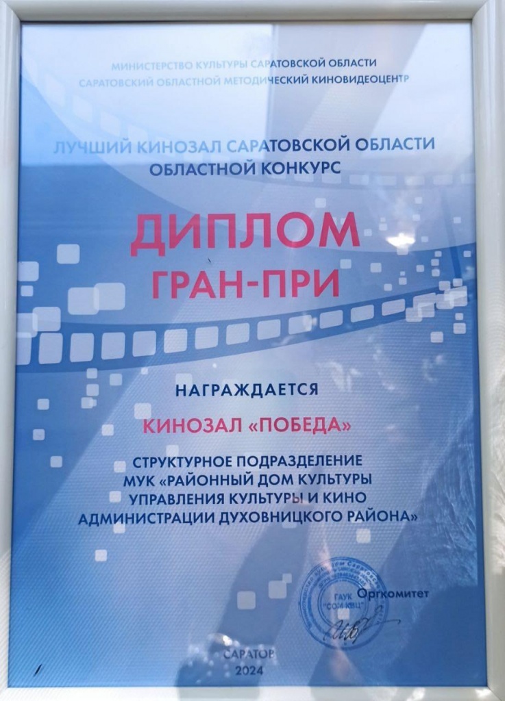 МУК "РДК УК" структурное подразделение кинозал "Победа" стал победителем и обладателем диплома Гран-При областного конкурса "Лучший кинозал Саратовской области" и денежной премии в размере 50 тысяч рублей.