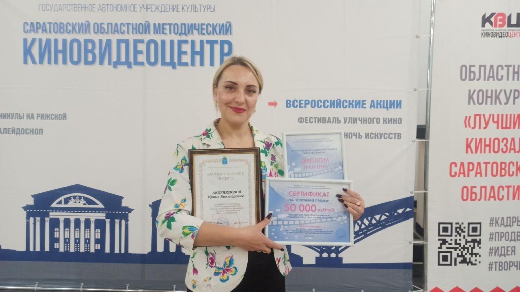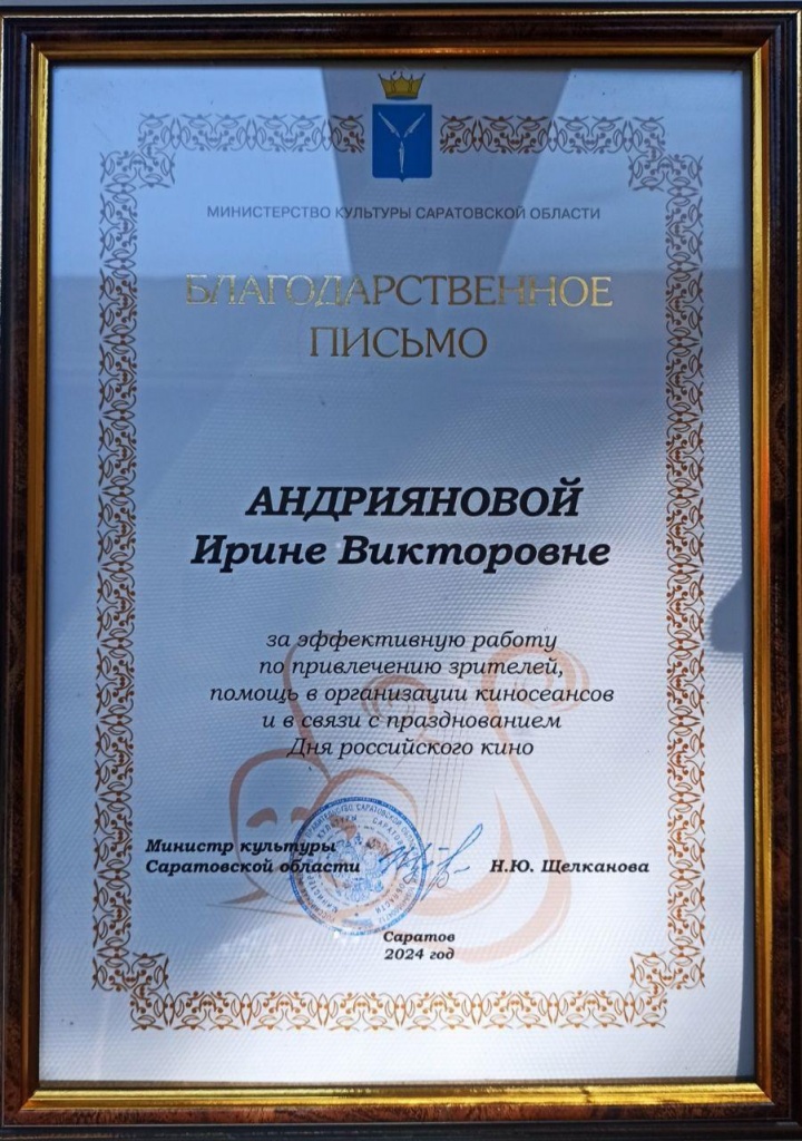 За эффективную работу по привлечению зрителей, помощь в организации киносеансов и в связи с празднованием Дня российского кино Министр культуры Саратовской области Н.Ю. Щелканова вручила благодарственное письмо заведующей МУК "РДК УК" структурным подразделением кинозал "Победа" И.В. Андрияновой.
