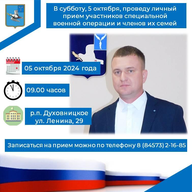 В субботу, 05 октября 2024 года с 09.00 часов исполняющий обязанности главы Духовницкого муниципального района Иван Сергеевич Лялин будет проводить прием по личным вопросам участников специальной военной операции, их родных и близких.