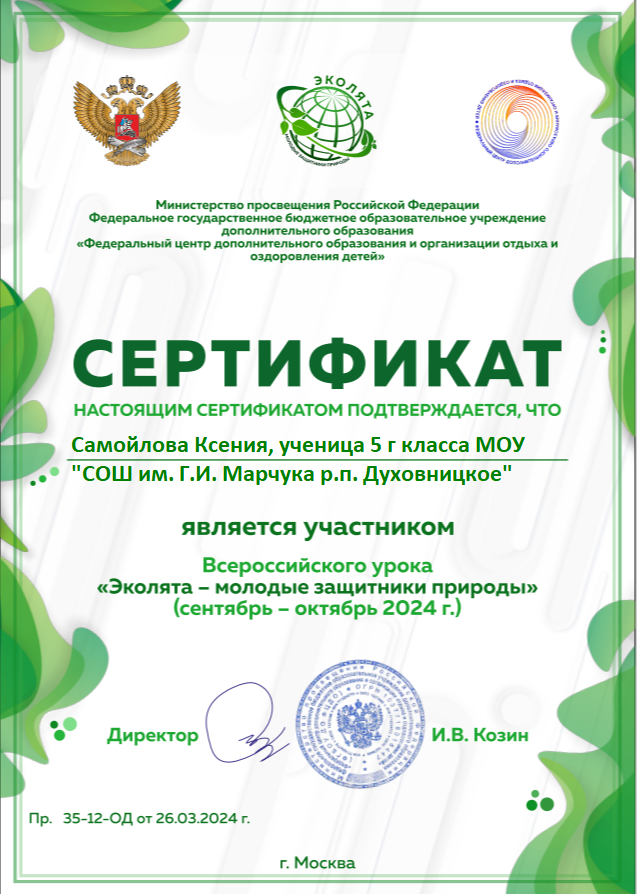 2 октября в филиале МОУ «СОШ им.Г.И.Марчука р.п.Духовницкое» в с.Липовка, на базе центра «Точка роста» педагогом дополнительного образования Федуловой И.Н. был проведен Всероссийский урок «Эколята – молодые защитники природы» для учащихся 5 класса на тему «Зеленое волонтерство».