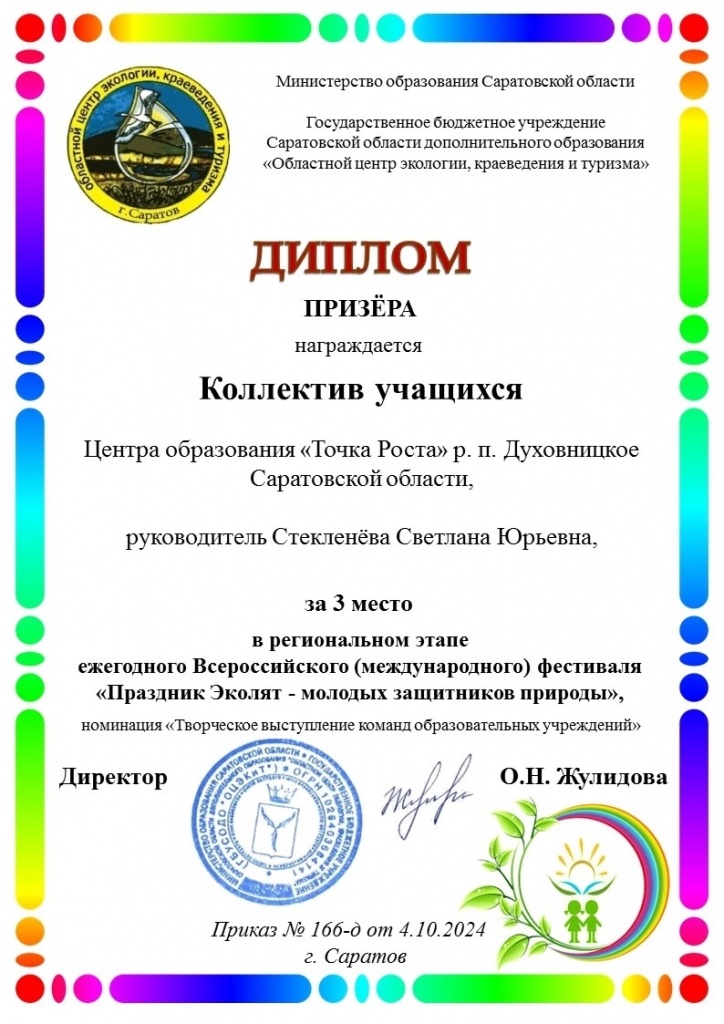 Ребятам кружка "Практическая биология", руководитель: Стекленёва С.Ю. МОУ "СОШ им.Г.И.Марчука р.п.Духовницкое" ЦО "Точка роста" был вручен диплом призера 3 место в номинации: "Творческое выступление команд образовательных учреждений".