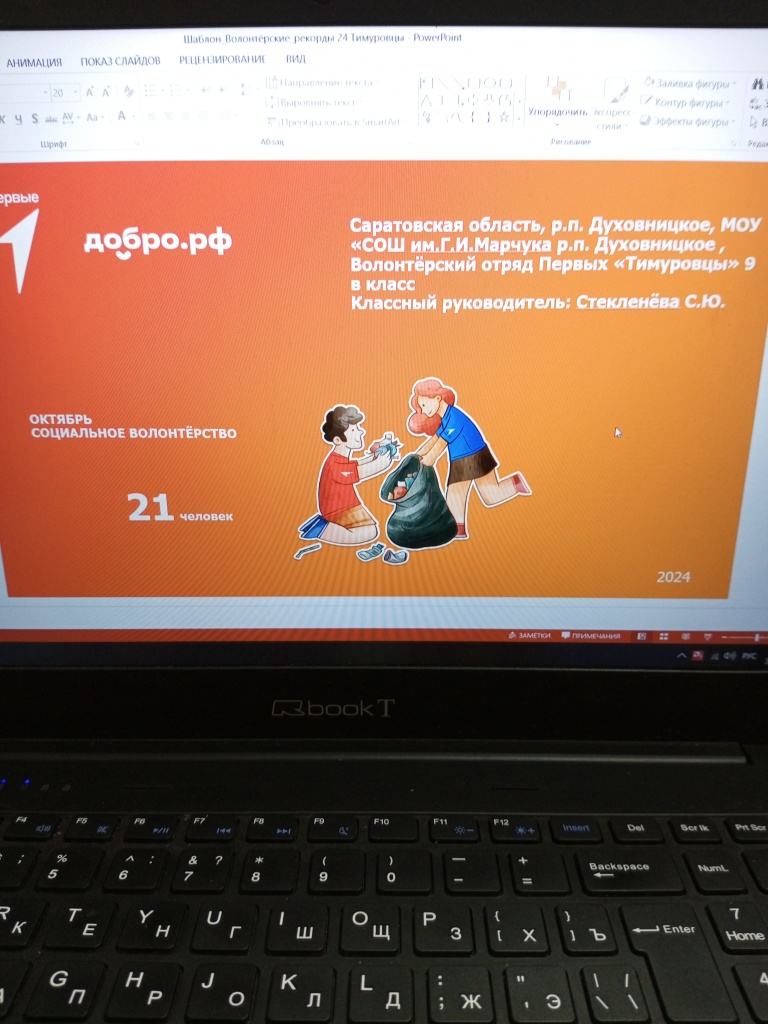 В течении октября, ученики 9 В класса из Волонтерского отряда Первых «Тимуровцы» МОУ "СОШ им.Г.И.Марчука р.п.Духовницкое" и своим наставником Стекленёвой С.Ю. принимали активное участие во Всероссийском соревновании "Волонтёрские рекорды Первых".