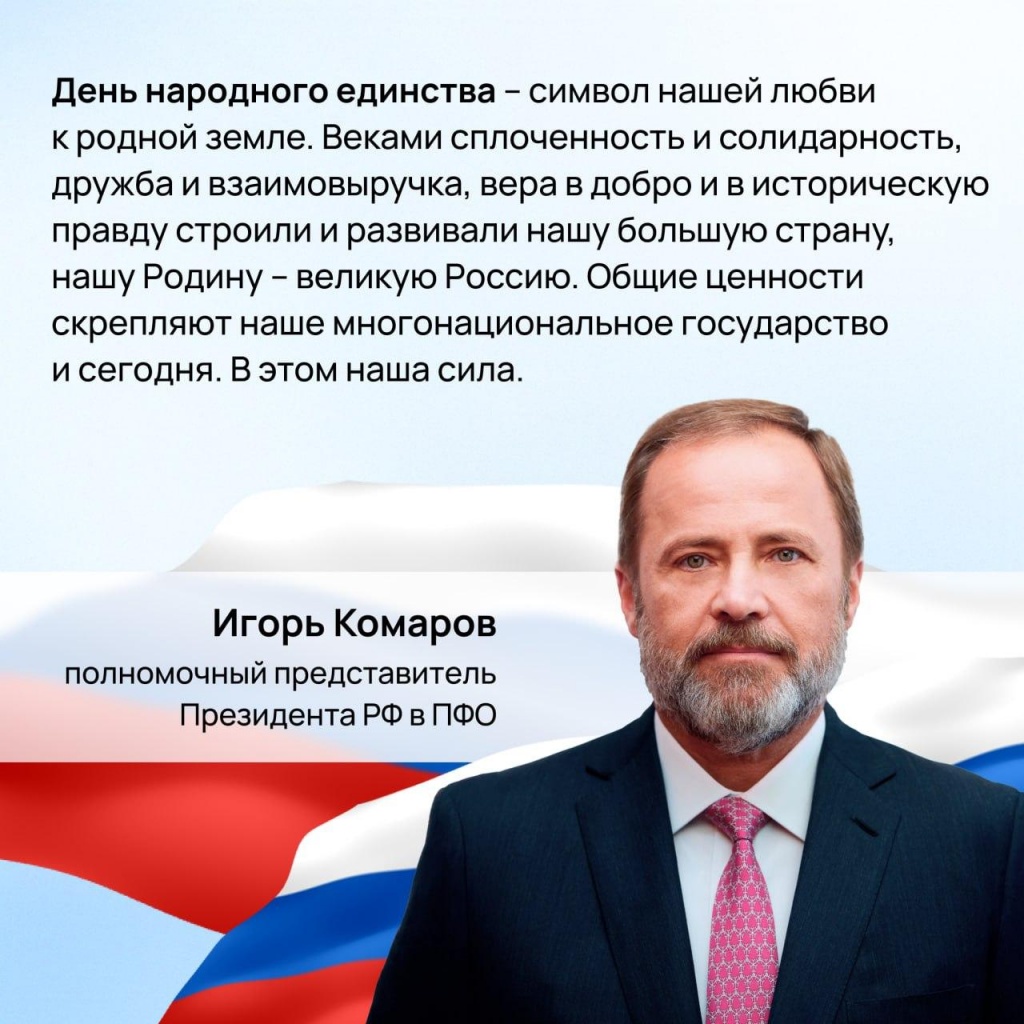 Полномочный представитель Президента РФ в ПФО Игорь Комаров поздравил жителей с Днем народного единства
