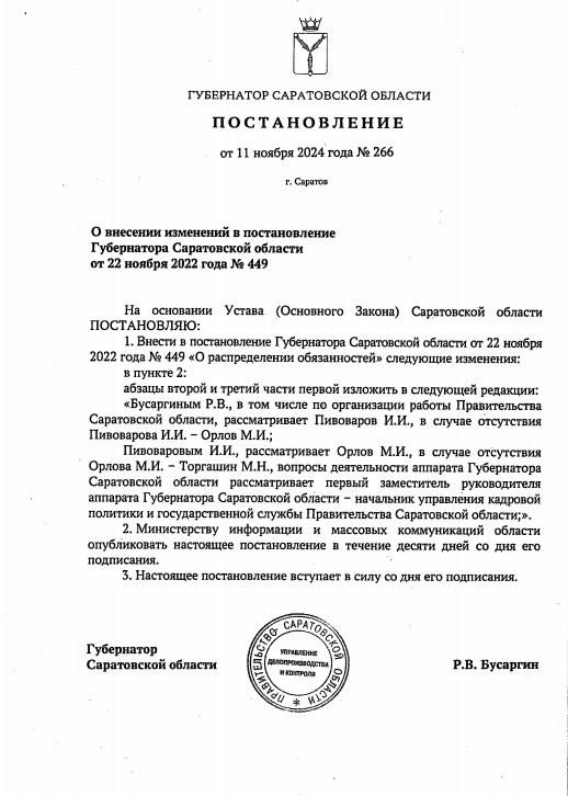 Губернатор Саратовской области Роман Бусаргин внес изменения в постановление «О распределении обязанностей».
