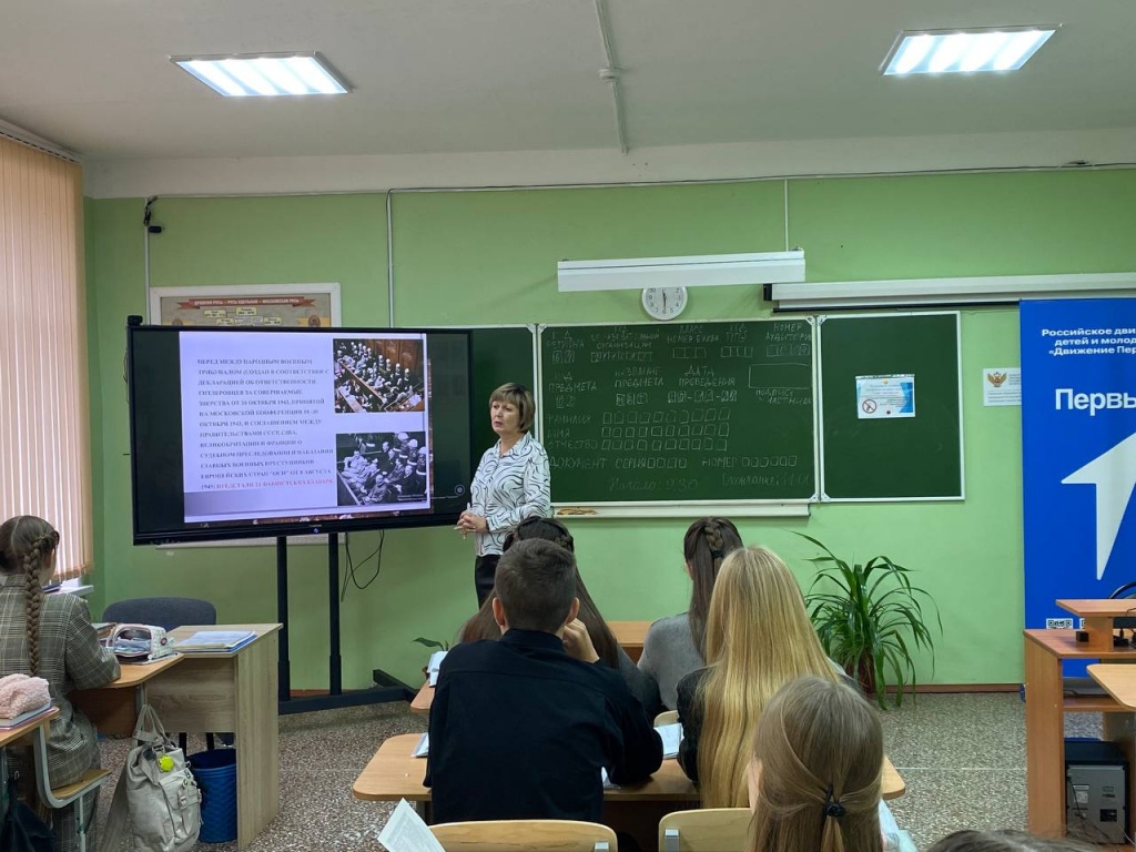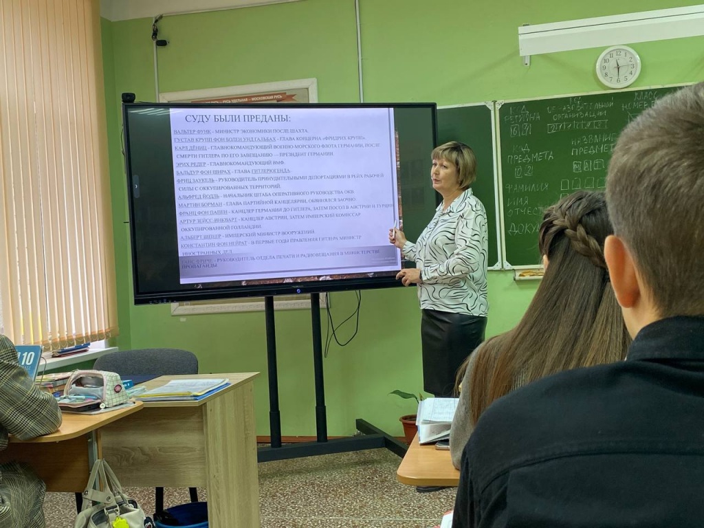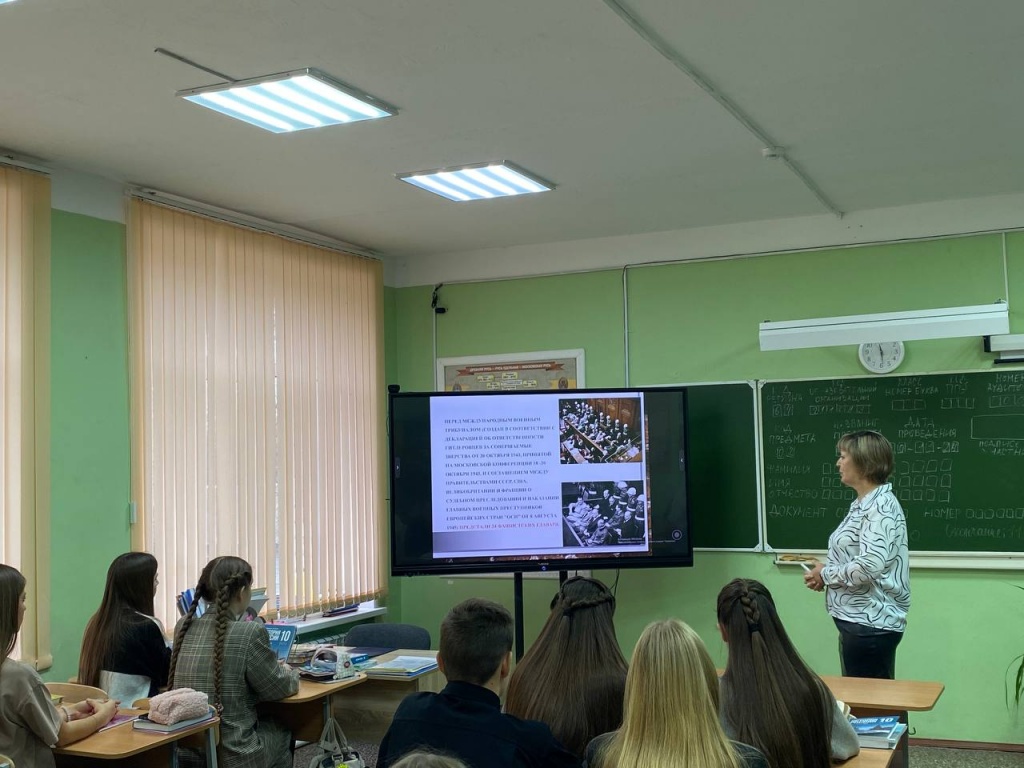 Сегодня в МОУ "СОШ им.Г.И.Марчука р.п.Духовницкое" состоялось внеклассное мероприятие для обучающихся 10 класса, проведенное советником директора Аксеновой Т.А., посвященное началу Нюрнбергского процесса. Это важное событие в истории международного права и прав человека было тщательно обсуждено и проанализировано учениками.
