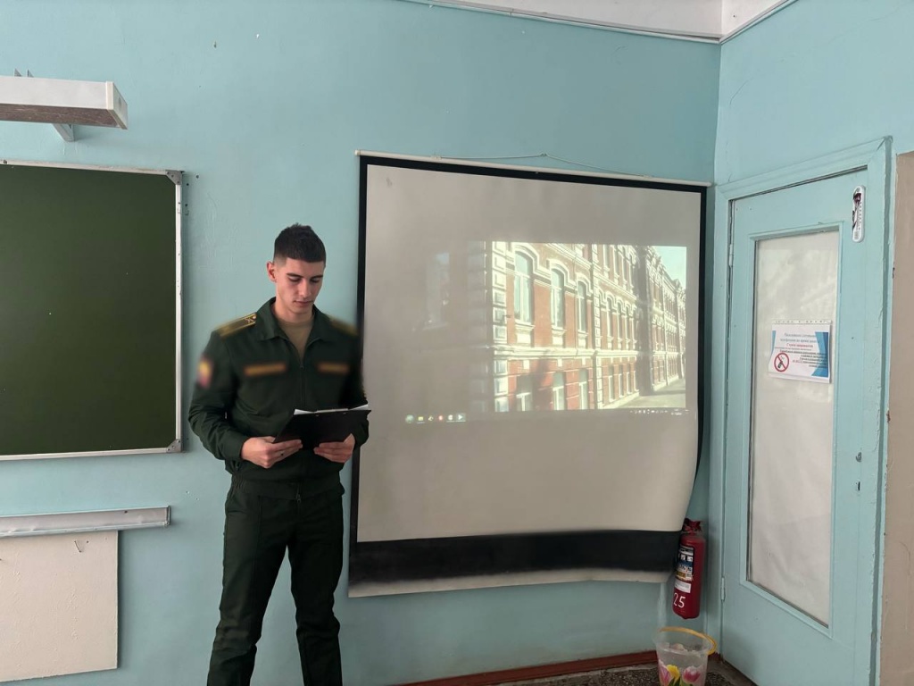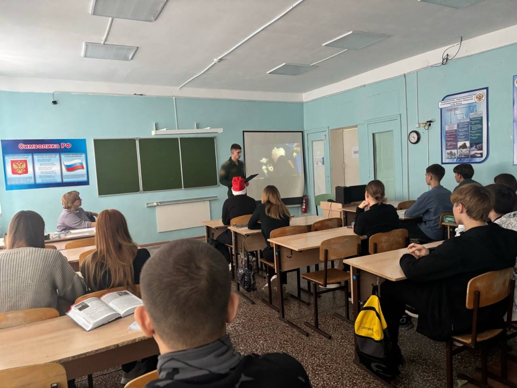 В рамках X Всероссийской информационно-агитационной акции "Есть такая профессия - Родину защищать!" 25 декабря 2024 года в МОУ "СОШ им.Г.И Марчука р.п.Духовницкое" прошла встреча курсанта 3 курса Военной академии материально-технического обеспечения (филиала г. Вольска) Санжаревского К. с обучающимися 11 класса.