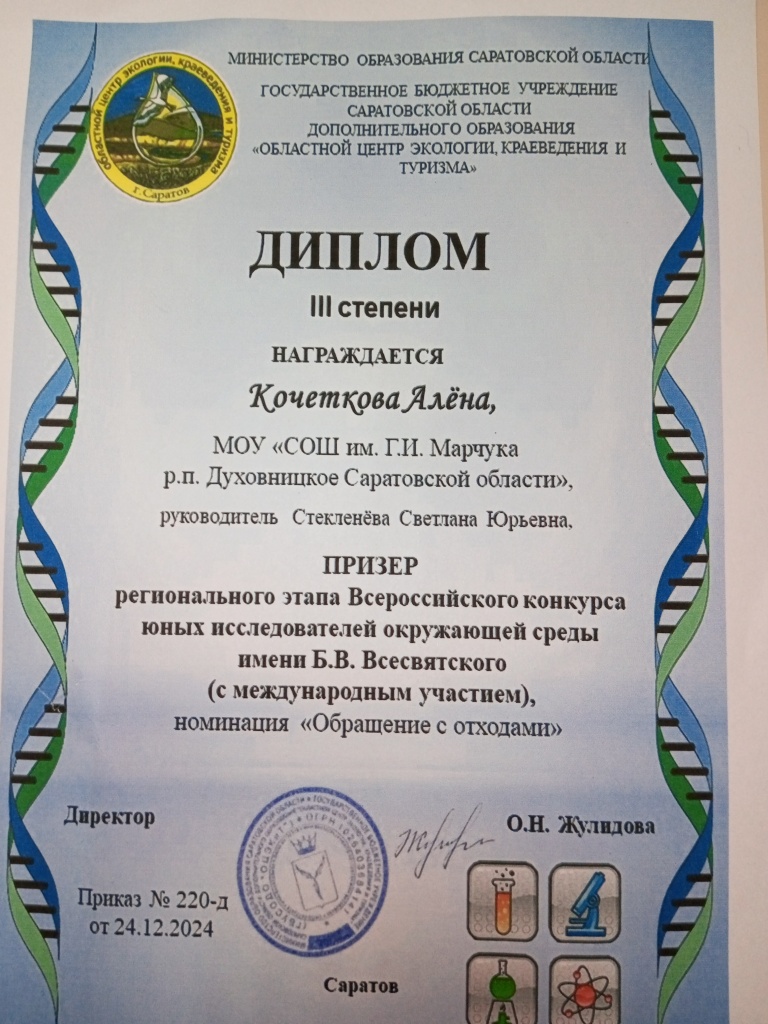 Призёром конкурса стала Кочеткова Алена, ученица 9 "в" класса МОУ "СОШ им.Г.И.Марчука р.п.Духовницкое". (руководитель: Стекленёва С. Ю.). Алена награждена Дипломом 3 степени в номинации "Обращение с отходами".