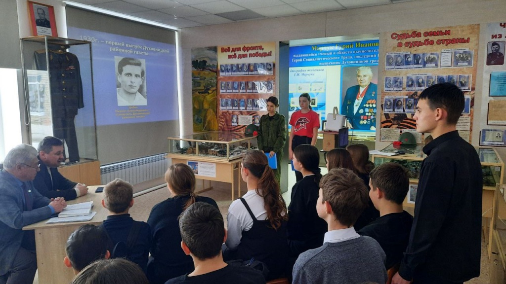 10 января в музее МОУ «СОШ им.Г.И.Марчука р.п.Духовницкое» состоялась встреча обучающихся 8А класса с работниками Духовницкой районной газеты «Авангард», членами Союза журналистов России Глуховым Р.Г. – директором-главным редактором и Прониным Ю.А. – заместителем главного редактора, лауреатом премии губернатора Саратовской области в сфере журналистики. Встреча была посвящена Дню российской печати, которая, ежегодно отмечается 13 января.